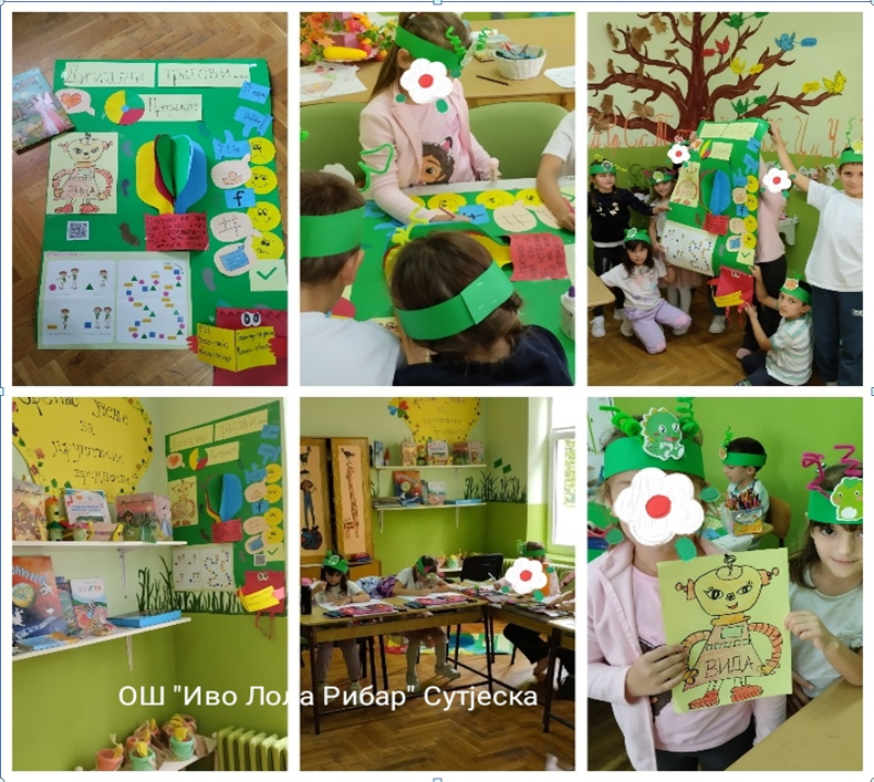 Након прочитане приче, разговарали смо шта су то дигитални трагови, где их видимо и шта они откривају о нама. Причали смо о томе шта деца гледају, колико дуго, а шта прате њихови родитељи.. затим смо правили наше мале мапе дигиталних трагова. Закључили да пазимо како се понашамо према другима и какве коментаре остављамо, лајкове и да имамо на уму да нас тако прате. Затим смо направили један пано као подсетник кроз шта је наша Вида прошла… уз круне са сигналима.. Веома нам се свиђа песмица са кјуар кодом коју смо такође залепили на пано да и остали могу да је чују.